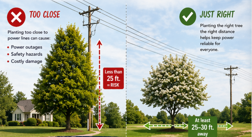 A la hora de plantar árboles, siempre hay que tener en cuenta el espacio disponible, no solo por su aspecto actual, sino también por cómo crecerán con el tiempo. Esto incluye mantener una distancia de seguridad con respecto a las líneas eléctricas aéreas y las instalaciones subterráneas.